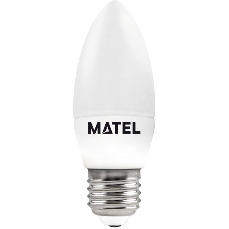 Lampadina LED MATEL a candela E27 7W. Classificazione F, risparmio fino al 90% di energia. Accensione elettronica istantanea e prestazioni elevate. Angolo di apertura della luce non inferiore a 200°. Corpo in PC bianco con interno in alluminio e copertura fumè. Vita utile media fino a 30.000 ore. Lampadina con temperatura colore 2700K (calda). Installazione diretta, non necessita di trasformatore aggiuntivo. Ideale per ambienti di riposo e relax: camere da letto, soggiorni, ecc.