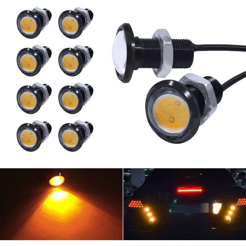 Caratteristiche: Rendi la tua notte piu luminosa: Lampadine LED DRL estremamente luminose 3000K ambra (6000K bianco, rosso) 18mm (23mm) nebbia occhio d'aquila. Le lampadine super luminose emettono luce ambra ultra pura (bianca, rossa) con un basso consumo energetico e un basso calore che puo fornire una visione molto chiara durante la guida. Alte prestazioni: Ogni occhio d'aquila e dotato di chipset ad alta potenza super luminosi, basso consumo energetico, bassa temperatura e alta luminosita, porta la sicurezza con te sulla strada. Costruzione solida: Telaio in lega di alluminio + lente di condensazione, 100% impermeabile e resistente alla polvere per tutti i tipi di tempo, durata della vita oltre 50.000 ore. Installazione facile: Progettato semplicemente per un facile montaggio, puo essere installato su qualsiasi superficie del veicolo praticando fori, collegare i fili positivo e negativo e fatto. Ampia applicazione: Questa luce a led a occhio d'aquila ha molti usi, puoi usarla come