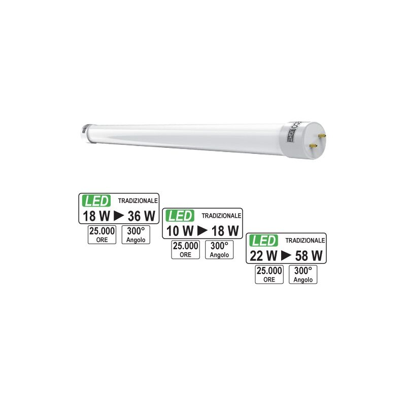Tecnologia led in classe a+. consumi ridotti al 50%. attacco g13 - struttura in vetro - luce fredda e neutra. 10watt 6500k luce fredda lumen 900 cm.60