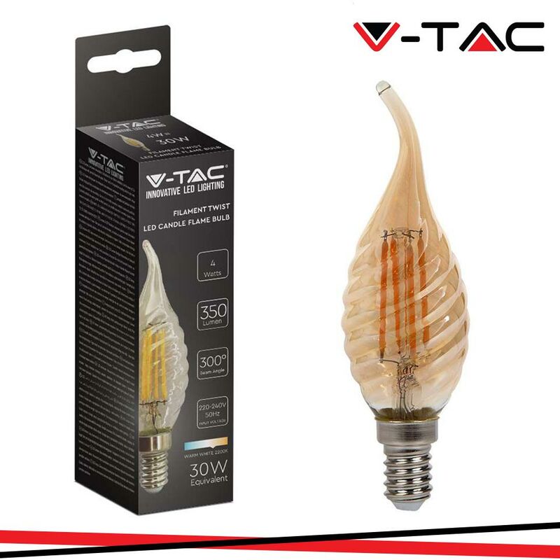 LED Lampadina 4W Filamento E14 Amber Cover Candela Tip 2200K SKU: 217116: VT: VT-1947-N Caratteristiche del prodotto 80% di consumo energetico in meno rispetto alle lampadine standard Lunga durata Nessuna emissione di radiazioni UV e radiazioni non ionizzanti Accensione immediata, nessun tempo di riscaldamento Bassa potenza termica Direttamente sostituibile alle lampade ad incandescenza tradizionali Installazione Aree Commerciali e Residenziali Hotel, Bar Stand espositivi Lampadari Allaperto, esclusivamente allinterno di apparecchi idonei. Specifiche tecniche Informazione generale Attacco E14 Tipo Lampadina Candela fiamma Tipo LED Filamento Vitamedia 20,000 ore Dati elettrici Potenza 4W Potenza EQV. a incandescenza 30W Tensione AC:220-240V Frequenza 50Hz Fattore di potenza >0.4 Dati tecnici luce Fascio Luminoso° 300° Colore della luce Bianco caldo Temperatura di colore 2200K Flusso luminoso (lm) 350 lm Indice di resa cromatica Ra >80 Dettagli corpo Materiale Vetro Funzionalità IP
