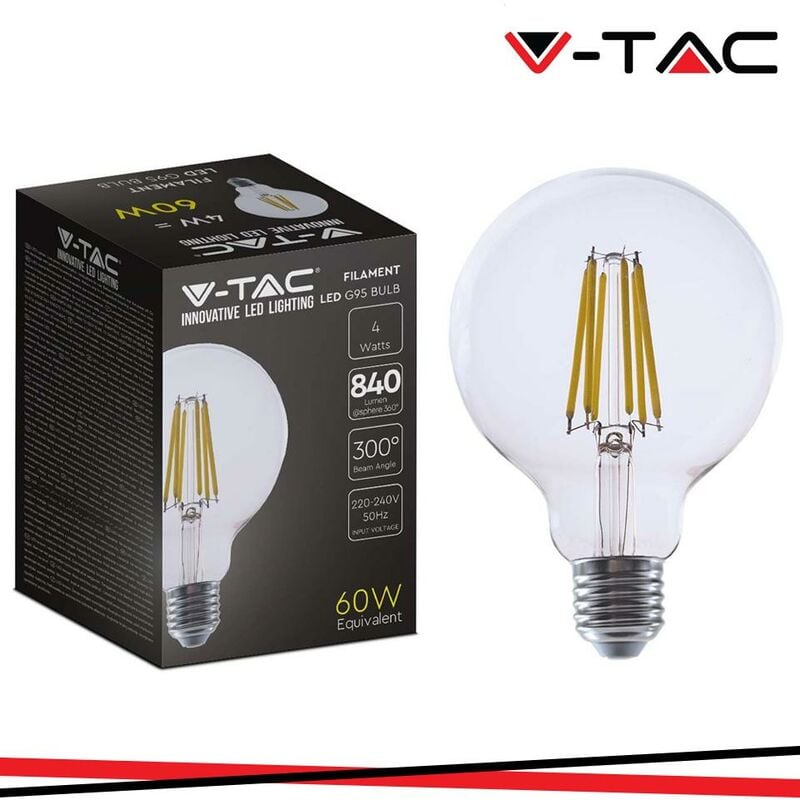 LED Lampadina 4W Filamento E27 G95 Clear Cover 4000K SKU: 2995: VT: VT-2354 Caratteristiche del prodotto 80% di consumo energetico in meno rispetto alle lampadine standard Lunga durata Nessuna emissione di radiazioni UV e radiazioni non ionizzanti Accensione immediata, nessun tempo di riscaldamento Bassa potenza termica Direttamente sostituibile alle lampade ad incandescenza tradizionali Installazione Aree Commerciali e Residenziali Hotel, Bar Stand espositivi Lampadari Allaperto, esclusivamente allinterno di apparecchi idonei. Specifiche tecniche Informazione generale Attacco E27 Tipo Lampadina G95 Tipo LED Filamento Vitamedia 20,000 ore Dati elettrici Potenza 4W Potenza EQV. a incandescenza 60W Tensione AC:220-240V Frequenza 50Hz Dati tecnici luce Fascio Luminoso° 300° Efficienza luminosa (lm/W) 210 lm/W Colore della luce Bianco naturale Temperatura di colore 4000K Flusso luminoso (lm) 840 lm Indice di resa cromatica Ra >80 Dettagli corpo Materiale Vetro Funzionalità IP Protezione