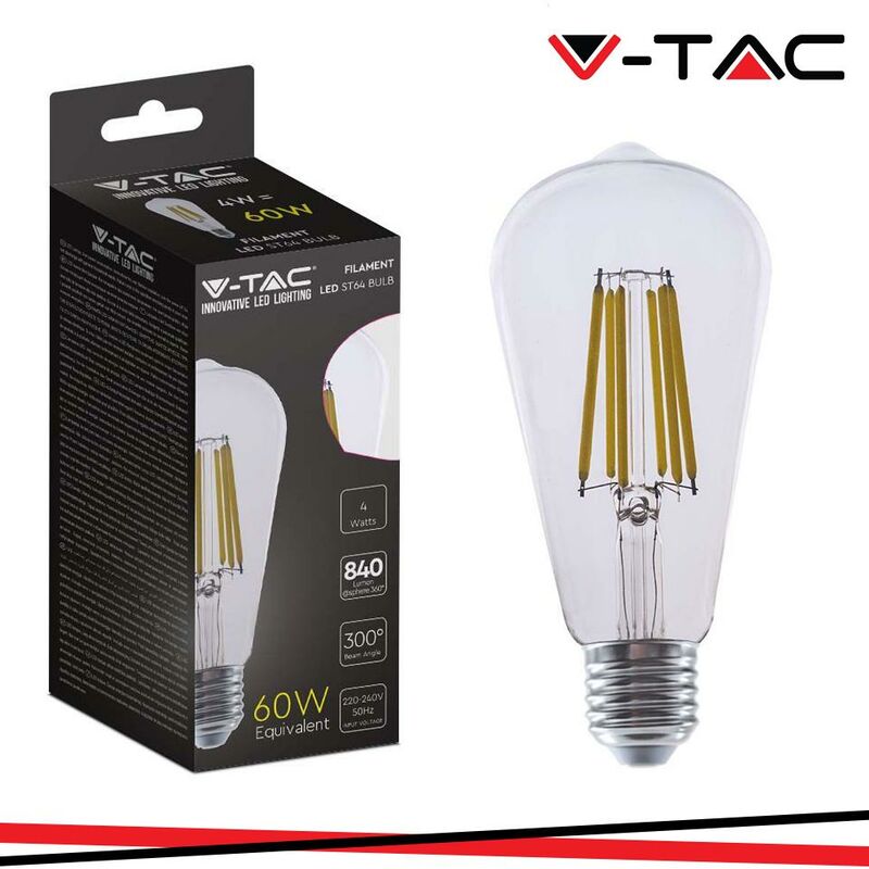 LED Lampadina 4W Filamento E27 ST64 Clear Cover 4000K SKU: 2997: VT: VT-2364 Caratteristiche del prodotto 80% di consumo energetico in meno rispetto alle lampadine standard Lunga durata Nessuna emissione di radiazioni UV e radiazioni non ionizzanti Accensione immediata, nessun tempo di riscaldamento Bassa potenza termica Direttamente sostituibile alle lampade ad incandescenza tradizionali Installazione Aree Commerciali e Residenziali Hotel, Bar Stand espositivi Lampadari Allaperto, esclusivamente allinterno di apparecchi idonei. Specifiche tecniche Informazione generale Attacco E27 Tipo Lampadina ST64 Tipo LED Filamento Vitamedia 20,000 ore Dati elettrici Potenza 4W Potenza EQV. a incandescenza 60W Tensione AC:220-240V Frequenza 50Hz Dati tecnici luce Fascio Luminoso° 300° Efficienza luminosa (lm/W) 210 lm/W Colore della luce Bianco naturale Temperatura di colore 4000K Flusso luminoso (lm) 840 lm Indice di resa cromatica Ra >80 Dettagli corpo Materiale Vetro Funzionalità IP