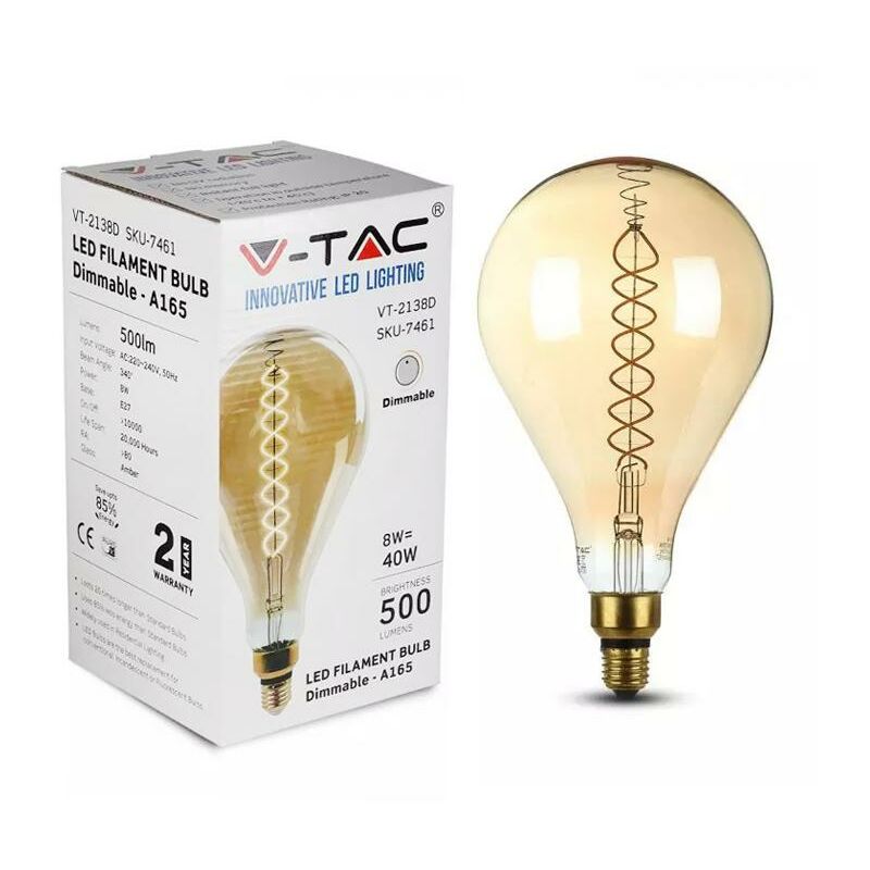 LED Lampadina 8W Filamento E27 A165 Dimmerabile 2000K SKU: 7461: VT: VT-2138D Caratteristiche del prodotto 80% di consumo energetico in meno rispetto alle lampadine standard Lunga durata Nessuna emissione di radiazioni UV e radiazioni non ionizzanti Accensione immediata, nessun tempo di riscaldamento Bassa potenza termica Direttamente sostituibile alle lampade ad incandescenza tradizionali Installazione Aree Commerciali e Residenziali Hotel, Bar Stand espositivi Lampadari Allaperto, esclusivamente allinterno di apparecchi idonei. Specifiche tecniche Informazione generale Attacco E27 Tipo Lampadina A165 Tipo LED Filamento Vita media 20 000 h Dati elettrici Potenza 8W Potenza EQV. a incandescenza 40W Tensione AC: 220-240V Frequenza 50Hz Fattore di potenza >0.5 Dati tecnici Luce Colore della luce Bianco caldo Temperatura di colore 2000K Flusso luminoso 500 lm Indice di resa cromatica Ra >80 Fascio Luminoso 340° Dettagli corpo Materiale Vetro Colore Amber Funzionalità Dimmerabile Si IP