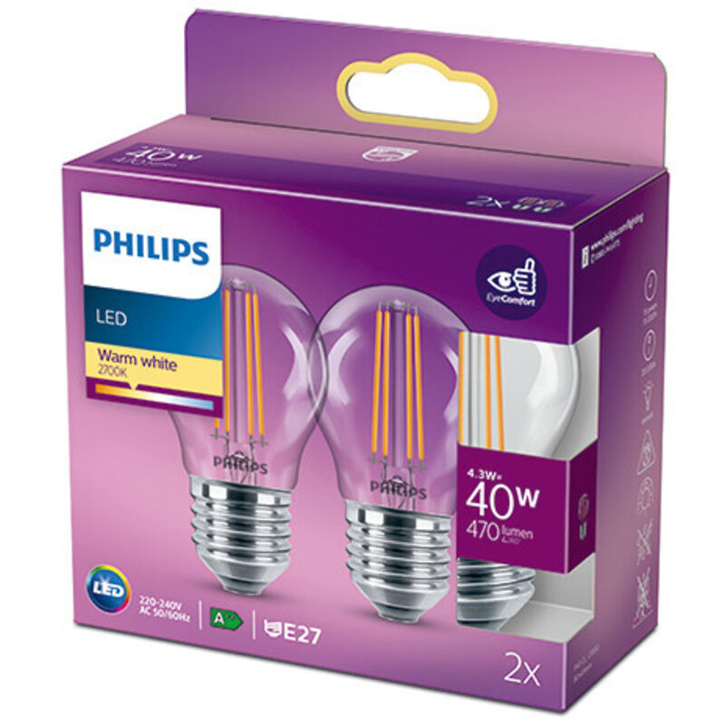 Lampadina a led a filamento philips sfera 40w e27 2700k, luce calda 2 pz forma della lampada: sfera attacco e27 tecnologia led-filamento luce calda 2700 k flusso luminoso nominale 470 lm potenza nominale 4,3 w wattaggio lampada equivalente 40 w tempo di accensione