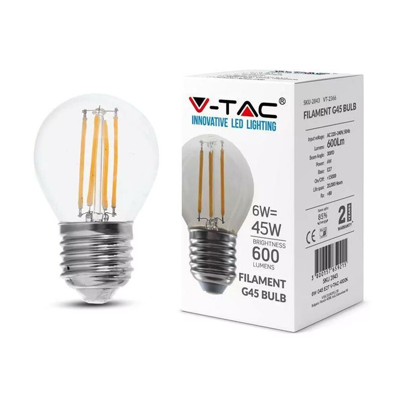 LED Lampadina 6W Filamento E27 G45 trasparente 6400K SKU: 2844: VT: VT-2366 Caratteristiche del prodotto 80% di consumo energetico in meno rispetto alle lampadine standard Lunga durata Nessuna emissione di radiazioni UV e radiazioni non ionizzanti Accensione immediata, nessun tempo di riscaldamento Bassa potenza termica Direttamente sostituibile alle lampade ad incandescenza tradizionali Installazione Aree Commerciali e Residenziali Hotel, Bar Stand espositivi Lampadari Allaperto, esclusivamente allinterno di apparecchi idonei. Specifiche tecniche Informazione generale Attacco E27 Tipo Lampadina G45 Tipo LED Filamento Vitamedia 20 000 ore Dati elettrici Potenza 6W Potenza EQV. a incandescenza 45W Tensione AC:220-240V Frequenza 50Hz Fattore di potenza >0.5 Dati tecnici luce Fascio Luminoso° 300° Colore della luce Bianco Temperatura di colore 6400K Flusso luminoso (lm) 600 lm Indice di resa cromatica Ra >80 Dettagli corpo Materiale Vetro Funzionalità IP Protezione IP20 Tempo innesco