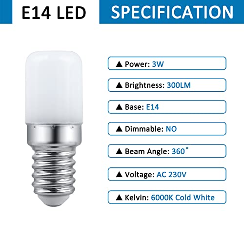 Lampadina LED E14 Frigo T18 AC230V 3W, 300LM Bianco Freddo 6000K, Non Dimmerabile, Equivalente a 30W Incandescenza, Lampadine LED E14 per Frigorifero, Lampada di Sale, Macchina da Cucire, 2 unità