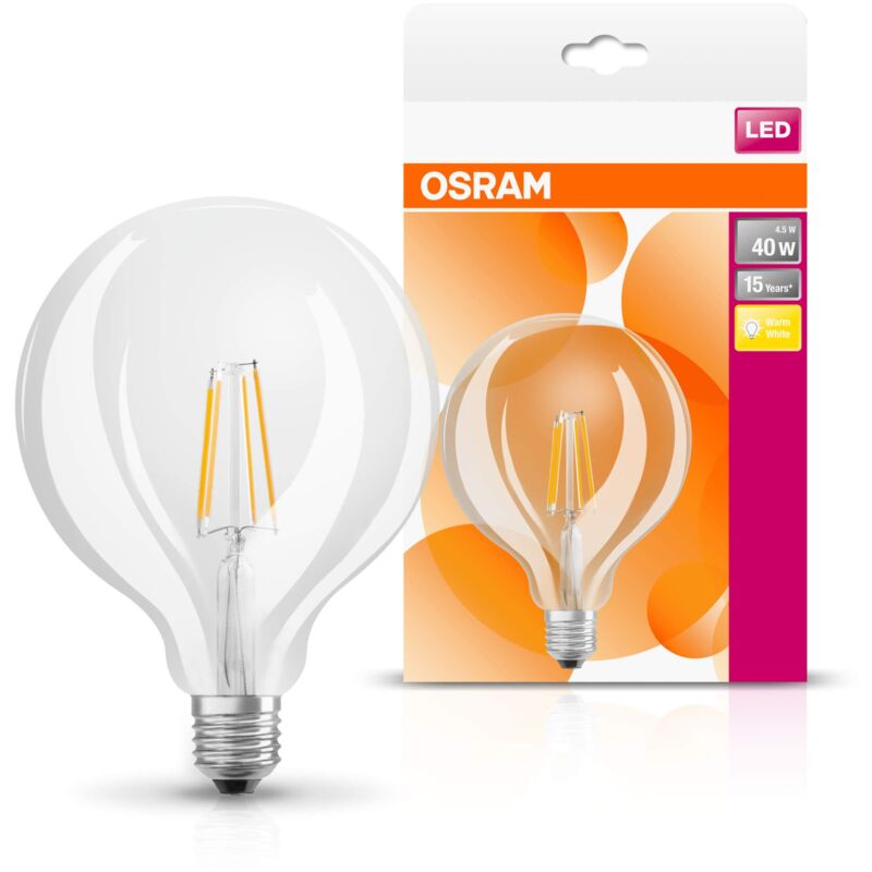 E27 lampadina a LED (big tappo a vite) Globe OSRAM con un consumo di 4W equivalente ad un'illuminazione alogena di 40W e permettendo di illuminare 470lm in colore di illuminazione Hot white 2700K. Peso: 0,095kg Modulo: Mondo Attacco: E27 Température de couleur (K): Blanc Chaud 2700K Certificazione: CE e ROHS Colore della luce: Bianco caldo Disponibilità: In magazzino