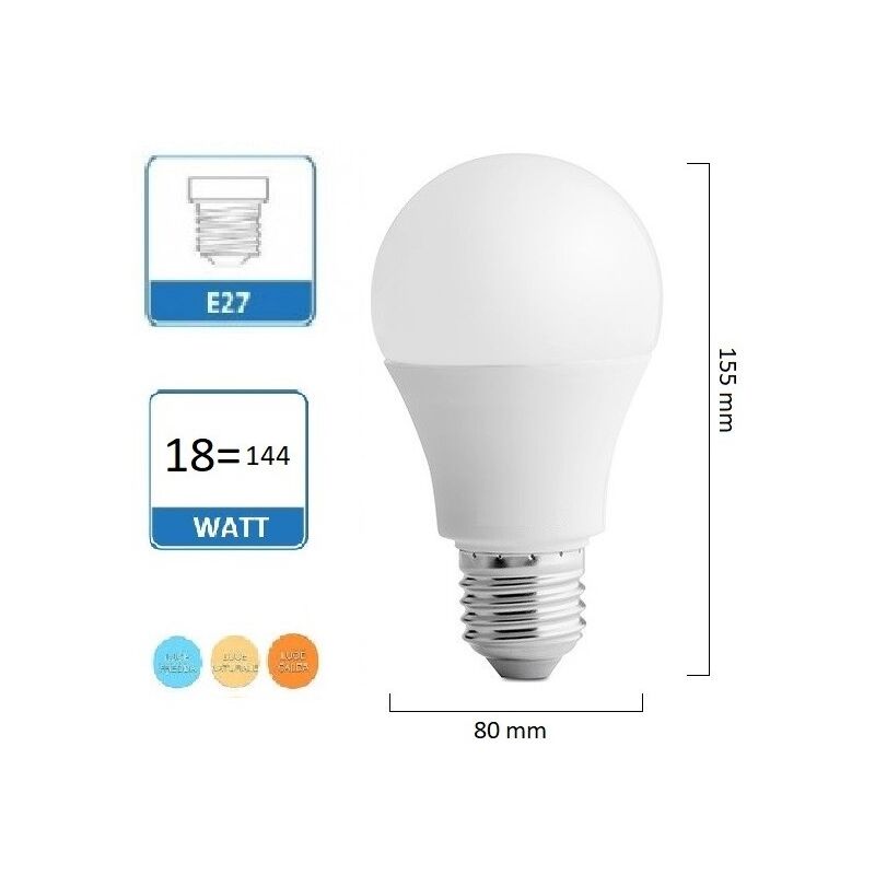 Caratteristiche Watt: 18 Lumen: 1700 Attacco: E27 Dimensioni Altezza: 155 mm Larghezza:80 mm