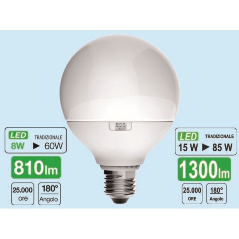 Lampadine Ecolight Led Globo Tecnologia Led in classe A+. Consumi ridotti al 90%. Attacco E27 15 Watt (90W) - 3000 K Luce Calda - Lumen 1300