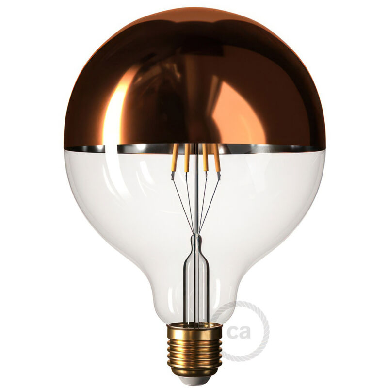 Lampadina led a globo G125 Creative-Cables E27 7W 2700K dimmerabile - DL700175 La lampadina è realizzata in vetro trasparente, con un rivestimento di colore rame sulla parte inferiore per creare effetti di luce unici. Per dimmerare correttamente una lampadina Led occorre un dimmer specifico. Tecnologia: Led Attacco: E27 Alimentazione: 220-240V Forma della Lampadina: Globo (G80,G95,G125,G200) Gradi Kelvin (K): 2700K (codice colore 827) Temperatura Colore: Luce calda Dimmerabile (Regolabile): Si, tramite dimmer esterno Potenza Assorbita (W): 7 Flusso Luminoso (Lumen): 806 Classe di efficienza energetica: F Grado di Protezione (IP): IP20 (lampadina da interno oppure da esterno se montata in apposito corpo illuminante) Numero di pezzi nella confezione: 1 Dimensioni (Cm): 17,5x12,5