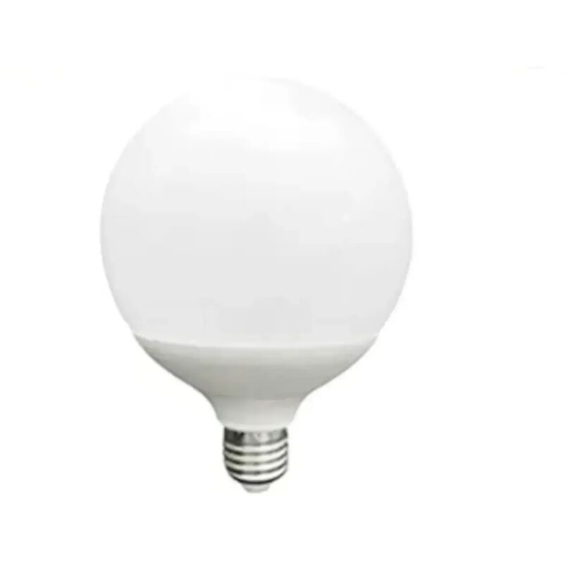 Lampadina globo lampada led a sfera 120 E27 bianco freddo 24 watt struttura in plastica ed alluminio alimentazione 220-240 volt il fascio luminoso non emette UV o IR apertura fascio luminoso 180° non dimmerabile grado di protezione IP20 uso in lampadari con coppa di vetro gradazione luce 6500k lumen 2400 altezza 160 mm diametro 120 mm