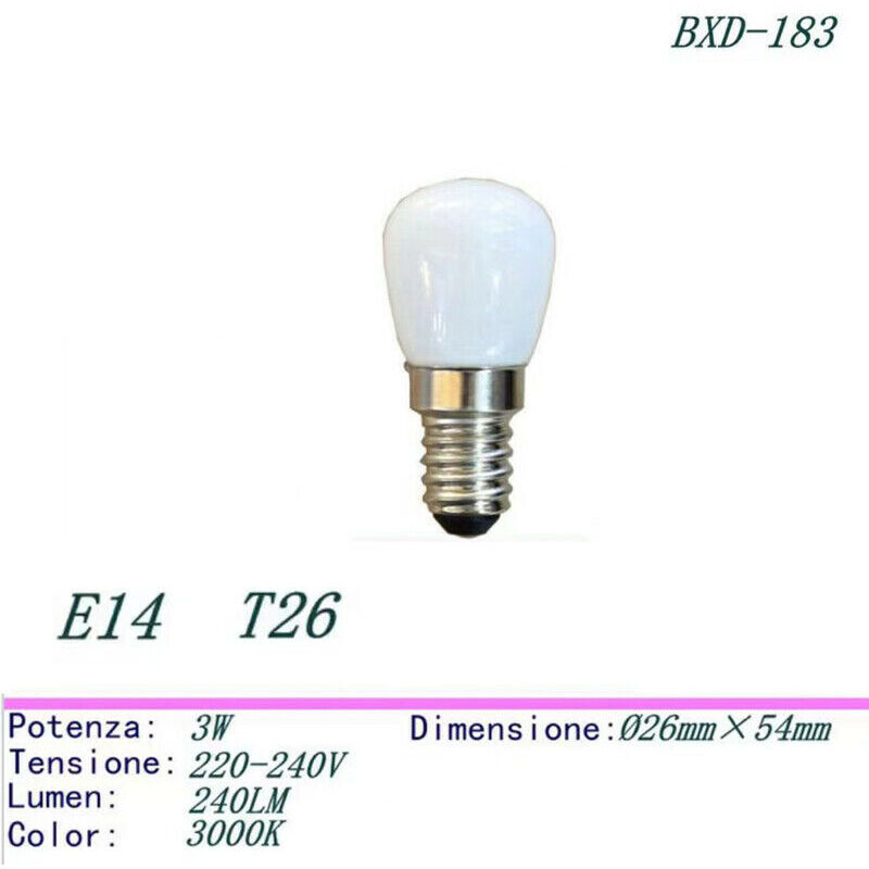 Lampadina led con attacco E14 3W, ideale come sostituzione delle classiche lampadine per frigoriferi congelatore e cappe. In vetro opaco, che rispetto alle coperture trasparenti, questa permette un ampio angolo di luminosità della luce emessa. MAGGIORI INFORMAZIONI Istruzione d'uso Potenza e consumo: 3 watt Equivalente alogeno: 25 watt Attacco: e14 Involucro opaco Temperatura colore: luce bianca 3000k Alimentazione: 220v Codice led: 2835 Angolo emissione luce: 360° Durata: 25.000h Lunghezza totale: 54 mm Diametro: 26 mm La confezione contiene: Nr.1 lampadina