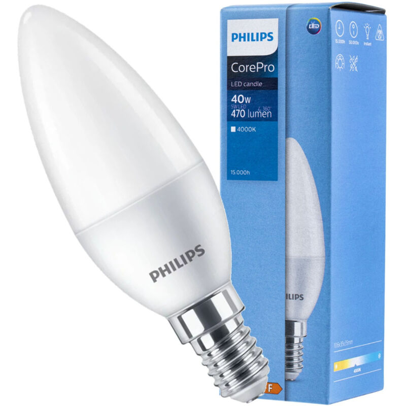 Lampadina Oliva LED Philips CorePro LEDcandle: Potenza 5W Luce naturale 4000K Attacco E14 Non dimmerabile 470 lumen Classe di efficienza energetica F Caratteristiche: Conformità a RoHS EU Sì Durata nominale (Nom) 15000 h Efficienza luminosa (specificata) (Nom) 94,00 lm/W Uniformità del colore