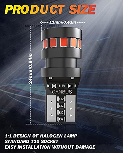 ★【Lampadina LED T10 W5W 501 194】300% più luminosa, voltaggio: 12V-24V, potenza: 2,5W/PC, lumen: 300LM/PC, rosso brillante. Ogni lampadina T10 ha chipset 18-2015 su di essa, angolo di illuminazione di 360 gradi, nessun punto cieco, almeno 3 volte più luminosa delle lampadine T10 di serie, super luminosa dona alla tua auto un nuovo look rinfrescato.