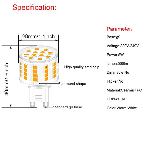 Ultra luminoso: lampadine LED G9 da 5 W, corrispondenti a lampadine alogene da 50 W, 500 lumen, illuminazione a 360 gradi senza punti ciechi. Ha la massima luminosità nello stesso prodotto, risparmio energetico del 90%.