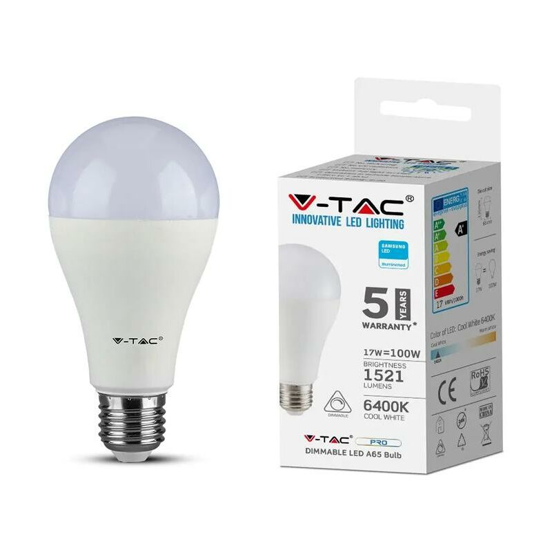 LED Lampadina SAMSUNG Chip 17W E27 A65 Plastica 4000K Dimmerabile SKU: 20189: VT: VT-217D Caratteristiche del prodotto 80% di consumo energetico in meno rispetto alle lampadine standard Lunga durata Nessuna emissione di radiazioni UV e radiazioni non ionizzanti Accensione immediata, nessun tempo di riscaldamento Bassa potenza termica Direttamente sostituibile alle lampade ad incandescenza tradizionali Installazione Aree Commerciali e Residenziali Hotel, Bar Stand espositivi Lampadari Allaperto, esclusivamente allinterno di apparecchi idonei. Specifiche tecniche Informazione generale Attacco E27 Tipo Lampadina А65 Tipo LED SAMSUNG Chip Vitamedia 30 000 ore Dati elettrici Potenza 17W Tensione AC: 220-240V Frequenza 50Hz Fattore di potenza >0.5 Dati tecnici luce Fascio Luminoso° 200° Colore della luce Bianco naturale Temperatura di colore 4000K Flusso luminoso (lm) 1521 lm Indice di resa cromatica Ra >80 Dettagli corpo Materiale Plastica Funzionalità IP Protezione IP20 Dimmerabile Si