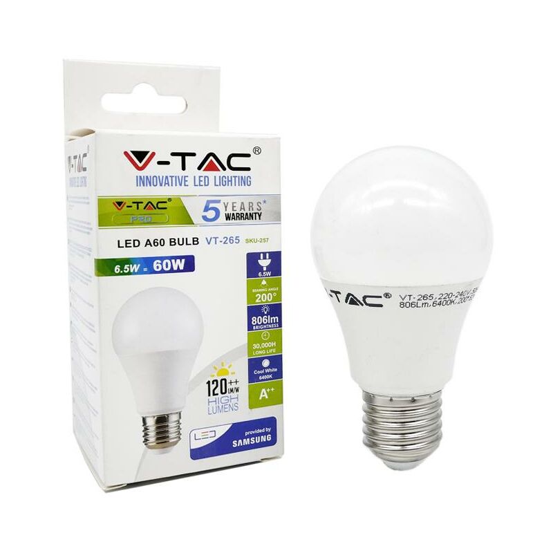 LED Lampadina SAMSUNG Chip 6.5W E27 A++ A60 Plastica 6400K SKU: 257: VT: VT-265 Caratteristiche del prodotto 80% di consumo energetico in meno rispetto alle lampadine standard Lunga durata Nessuna emissione di radiazioni UV e radiazioni non ionizzanti Accensione immediata, nessun tempo di riscaldamento Bassa potenza termica Direttamente sostituibile alle lampade ad incandescenza tradizionali Installazione Aree Commerciali e Residenziali Hotel, Bar Stand espositivi Lampadari Allaperto, esclusivamente allinterno di apparecchi idonei. Specifiche tecniche Informazione generale Attacco E27 Tipo Lampadina A60 Tipo LED SAMSUNG Chip Vitamedia 30000 ore Dati elettrici Potenza 6.5W Potenza EQV. a incandescenza 60W Tensione AC: 220-240V Frequenza 50Hz Fattore di potenza 50Hz Dati tecnici luce Efficienza luminosa (lm/W) 120 lm/W Fascio Luminoso° 200° Colore della luce Bianco Temperatura di colore 6400K Flusso luminoso (lm) 806 lm Indice di resa cromatica Ra >80 Dettagli corpo Materiale