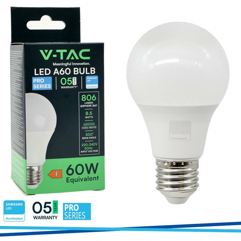 LED Lampadina SAMSUNG Chip 9W E27 A58 Plastica4000K SKU: 21229: VT: VT-210 Caratteristiche del prodotto 80% di consumo energetico in meno rispetto alle lampadine standard Lunga durata Nessuna emissione di radiazioni UV e radiazioni non ionizzanti Accensione immediata, nessun tempo di riscaldamento Bassa potenza termica Direttamente sostituibile alle lampade ad incandescenza tradizionali Installazione Aree Commerciali e Residenziali Hotel, Bar Stand espositivi Lampadari Allaperto, esclusivamente allinterno di apparecchi idonei. Specifiche tecniche Informazione generale Attacco Е27 Tipo Lampadina A58 Tipo LED SMD SAMSUNG Chip Vitamedia 20,000 ore Dati elettrici Potenza 8.5W Potenza EQV. a incandescenza 60W Tensione AC:220-240V Frequenza 50Hz Dati tecnici luce Fascio Luminoso° 200° Colore della luce Bianco naturale Temperatura di colore 4000K Flusso luminoso (lm) 806 lm Indice di resa cromatica Ra >80 Dettagli corpo Materiale Termoplastica Funzionalità IP Protezione IP20 Tempo innesco