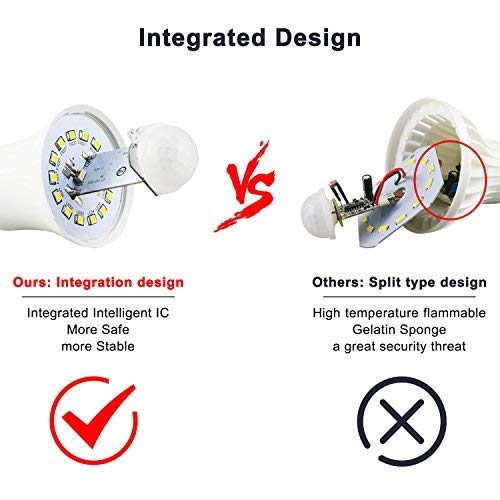 Super luminosità: 1020 e CRI alto (> 85), bianco freddo 6000 K. La lampadina del sensore di movimento da 12 W utilizza perle SMD di alta qualità, alta luminosità, nessun sfarfallio, nessun danno agli occhi.
