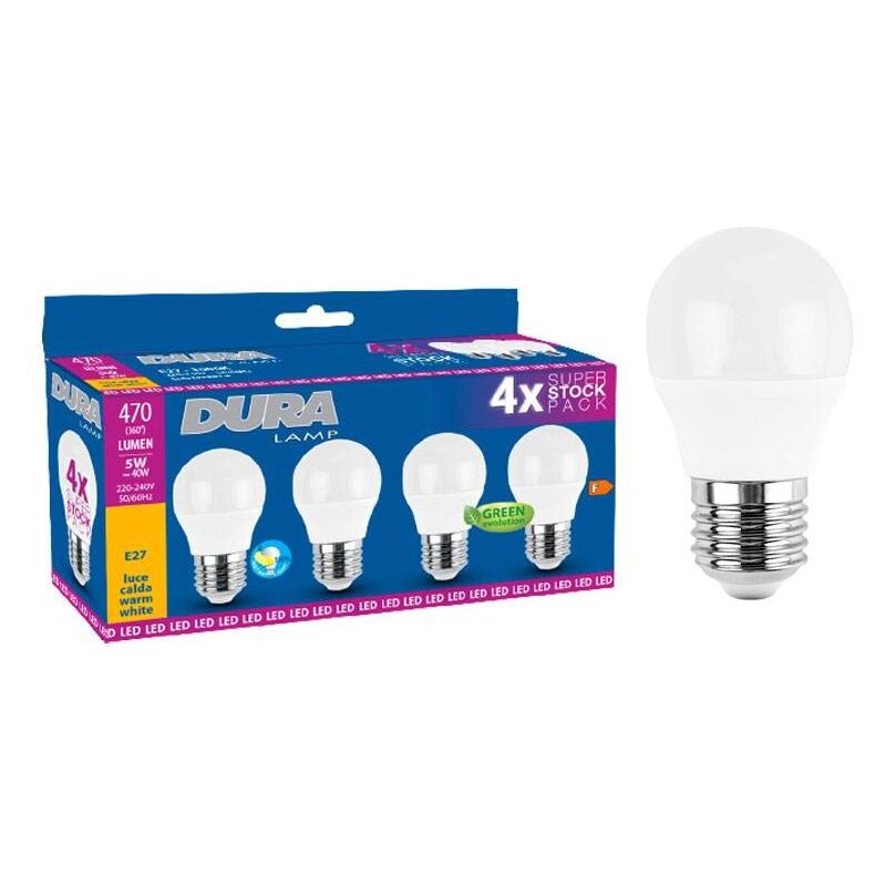 Lampadina Led a sfera Duralamp con le seguenti caratteristiche: Potenza: 5 Watt Tensione: 220-240 Vac Attacco: E27 Temperatura del colore: 3000K (luce calda) Fascio luminoso: 240 gradi Flusso: 470 lumen Grado di protezione: IP20 Classe energetica: F Non dimmerabile Confezione da 4 pezzi. Caratteristiche: Indice di resa cromatica: >80 Durata: 15000 ore Tempo di attivazione