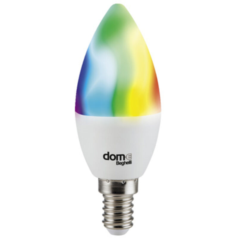 Lampadina Beghelli La lampadina smart dom-e Beghelli si controlla dallo smartphone tramite la rete Wi-Fi . › Colore: 16 Milioni› + luce bianca selezionabile 2700K-6500K › Accensione/spegnimento da interruttore o programmabili dall'App in base ad orari o eventi anche in abbinamento ad altri prodotti dom-e con funzioni di domotica.› Luce RGB con milioni di colori selezionabili a piacimento o tramite programmi pre-impostati nell'App› Possibilità di scegliere la temperatura colore della luce bianca da 2700K a 6500K tramite l'App› Wi-Fi standard: IEEE802.11 b/g/n - 2.4 GHz 5 W - Lumen 470 - Energy Class A+ - Life span: 25.000 h - Socket: E14 - Beam angle 180° - 220-240 V - 50/60 Hz - 45 mA - EC (kWh/1000h): 6 - Switching Cycles 30.000 - Instant Full Light - Surface Type: Opal - Dimensions 37x106 mm Con l'App dom-e sullo smartphone, accendi le luci e crei come vuoi l'atmosfera di casa tua. Si installa e si configura facilmente in pochi minuti! Funziona con: Apple iPhone iOS 8.0 o