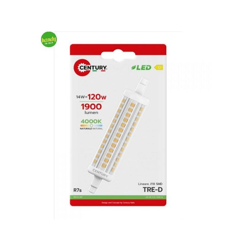 Lampadina Tre-D LED R7S prodotta dal brand Century. Questa lampadina erogauna potenza di 14W, la sua luce bianca naturale 4000K la rende adatta per tutti gli ambienti. 1990 lumen. Grado di protezione IP20.