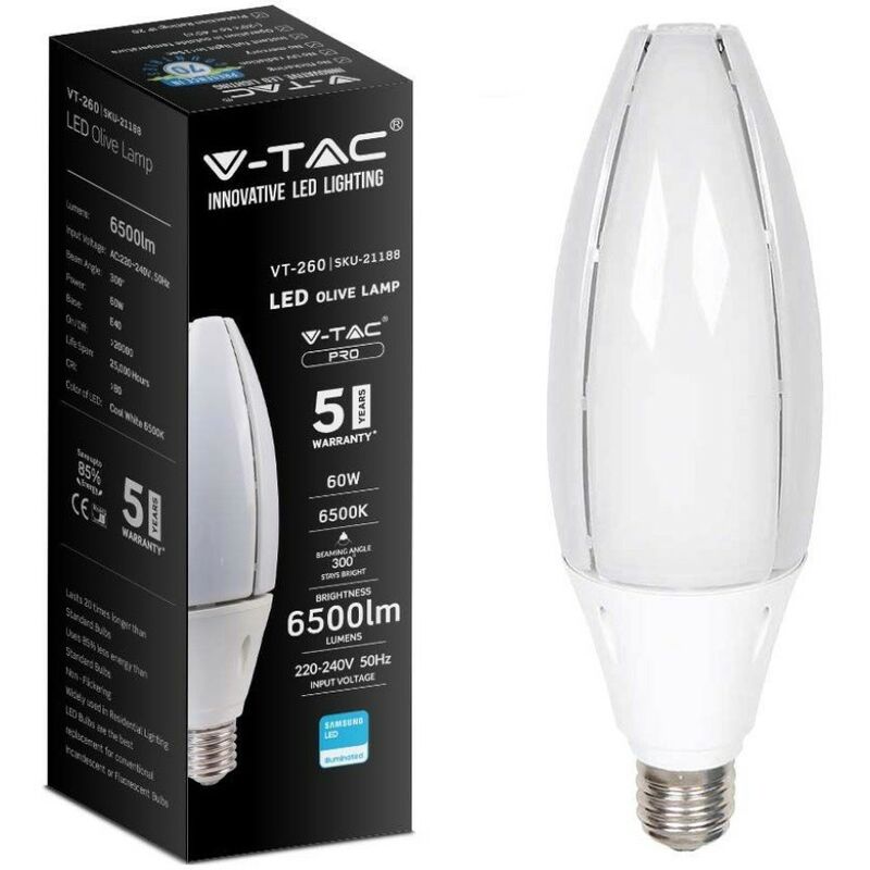 Lampadina LED industriale da 60W con attacco E40 e tecnologia LED Samsung SMD. Olive Lamp in materiale plastico e copertura opaca. Fascio luminoso di 300° e flusso luminoso di 6500 lm. Alta luminosità e rapporto di 108 lm/W. Disponibile con: Luce Bianca Naturale 4000K e Fredda 6400K. Dimensioni: Ø102x320mm. V-TAC PRO VT-260 LAMPADINA LED E40 60W OLIVE LAMP SMD CHIP SAMSUNG V-Tac Pro VT-260 è una lampadina LED da 60W di potenza con attacco E40 e tecnologia LED Samsung SMD. La sua forma a Oliva è realizzata in materiale plastico e la sua copertura è a finitura opaca. Con fascio luminoso di 300° e flusso luminoso di 6500 lm, questa lampadina ad alta luminosità ha un rapporto di 108 lm/W. SPECIFICHE TECNICHE • Attacco: E40 • Potenza: 60W • Tensione: AC 220-240V 50Hz • Fascio luminoso: 300° • Flusso luminoso: 6500 lm • Efficienza luminosa: 108 lm/W • Materiale: plastica • Copertura: opaca • Dimensioni: Ø 102 x 320 mm • Durata: 25.000 ore • Garanzia: 5 anni VARIANTI DISPONIBILI