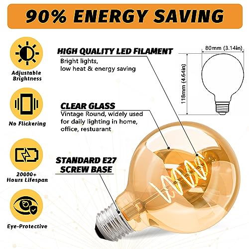 【Risparmio Energetico Durata della lampadina E27 Vintage】PUOSIKE E27 4W/6W G80 LED Vintage Light Bulb si ottiene la stessa luminosità della lampadina alogena da 40W/60W. La lampadina E27 vintage può far risparmiare fino al 90% di elettricità. La lampadina E27 funziona senza problemi ed emette una luce bianca calda e uniforme. La nostra E27 LED bianco caldo supporta circa 15.000 operazioni di accensione e spegnimento. Vita operativa: 20000 ore