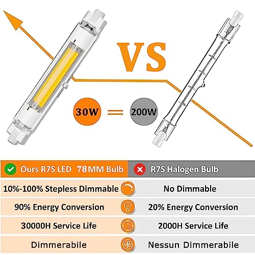 【R7S LED Risparmio Energetico 90% Percento di Energia】Lampadina led r7s 118mm 30w da equivalente la lampadine alogena r7s j118 da 150w 300w, risparmia fino al 90 percento di energia. Goditi il risparmio energetico dei r7s led senza sacrificare la qualità della luce. Bassa frequenza di sostituzione lampadina. Nessun piombo o mercurio, nessuna radiazione uv o ir.