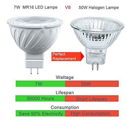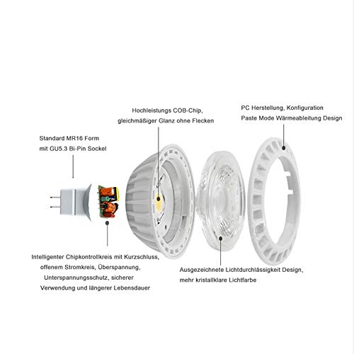 Caratteristiche tecniche: 6000 K 500 lm bianco freddo MR16 GU5.3 LED lampadine non dimmerabile, AC/DC 12 V, angolo di diffusione 38°, dimensioni: L 56 X D 55 mm;