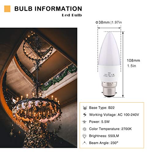 ✔ Questa lampadina B22 a candela piccola vite è adatta a tutti gli apparecchi di illuminazione con B22 come la lampadina di sale, lampadario moderno, lampade da tavolo Touch, luci seguenti, lampade da tavolo in ottone antico, lampada da soffitto in cristallo, lampadari foyer, lampade da terra, lampade a sospensione, notte lihgt lampadina e così via. Facile sostituzione della lampadina in pochi secondi, senza bisogno di attrezzi.