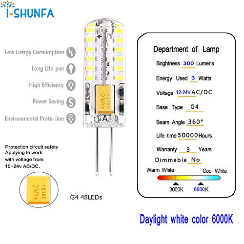 Qualità durevole: base bi-pin standard G4, sostituzione perfetta per alogena G4. Lunga durata fino a 35.000 ore, risparmiando costi di manutenzione sul cambio di lampadine frequente.