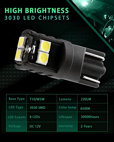 Illuminazione migliorata: migliora la tua illuminazione con le nostre lampadine LED T10. Dotato di 6 chip LED 3030 di alta qualità, emettono una luce luminosa di 220 lumen con una temperatura di colore nitida 6500K. Illumina l'ambiente circostante con chiarezza e precisione.