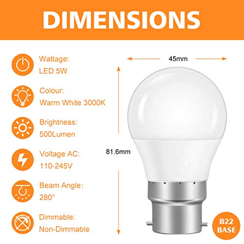 Lampadine LED B22 G45 5W Equivalenti a 40W, Lampadina a LED Luce Bianca Calda 3000k 500Lm, B22 Lampadine Baionetta G45 Forma Sfera Risparmio Energetico, Non Dimmerabile - Pacco da 6