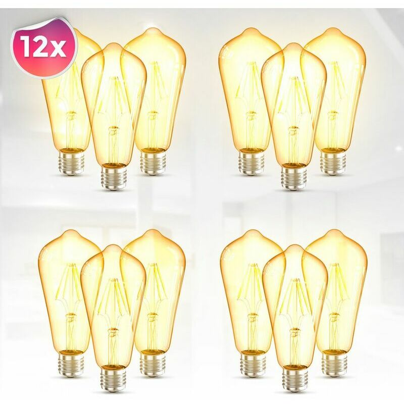 Lampadine LED, set di 4x 3 - LED/E27/ST64 4W 380lm 2.700K - durata 25.000h, Ra>=80, - non dimmerabile - 143x64mm (AxP) I 4x Set di 3 lampadine ST64 Edison Vintage I E27 4W 2700K 380lm I Bianco caldo I Lampadine a LED I Lampadina retrò I Filamento Decorativa: ricevi questa lampadina decorativa in un pratico set da 3 pezzi. Il sottile vetro color ambra esalta l'aspetto retrò e crea un'atmosfera confortevole e rilassata. Vintage: la lampada a filamento trasparente in stile Edison crea un ambiente di benessere con la sua luce morbida e calda. Non è regolabile. Tecnico: la lampadina retrò ST64 illumina con un colore della luce molto caldo e confortevole a 2.700 Kelvin. La base E27 standard può essere utilizzata nella maggior parte degli apparecchi. Con 4 watt e 380 lumen, questa lampadina di design consuma poca energia e fornisce un'illuminazione soffusa. Applicazione: la lampadina vintage funge da illuminazione nostalgica e antica ed è perfetta per lampade da tavolo, lampade da comodino