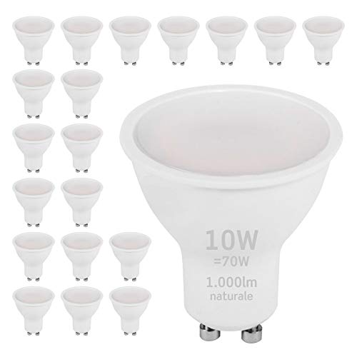 20x Lampadine LED GU10 10W Professionali Garanzia 5 anni Satinata Antiabbaglio (1000 lumen equivalenti a 70W) - Forma: Faretto - Luce Bianco Naturale 4000K - Fascio Luminoso 110°