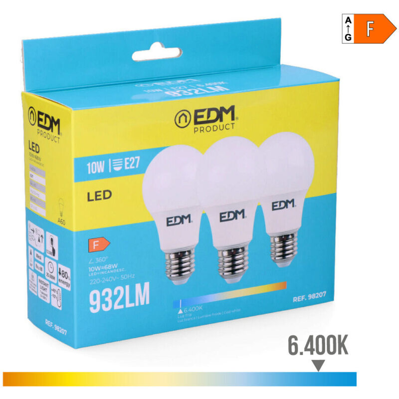 Lampadina LED E27 10W equivalente a 60W. Ombra leggera: Bianco di Giorno 6400K - angolo di illuminazione a 220°. Flusso luminoso 810lm con accensione immediata. Dimensioni: altezza: 11cm ф5,9cm - forma: rotondo A60. Lunga vita: 25000h, classe energetica A+. garanzia di 2 anni. Connessione AC220-240V. 6400K 10 810lm 60W 220° 25000h Imballaggio: Set di 3 Consumo di watt: 10 W Peso: 0,1040 kg Indice di protezione IP: IP20 Modulo: Rotondo A60 Attacco: E27 Flusso luminoso (lumen): 810lm Angolo di illuminazione: 220° Durata di vita: 25000 ore Watt equivalenti: 60 W Classe energetica: A+ Température de couleur (K): 6400K Altezza: 11 cm Certificazione: QUESTO Larghezza: 5,9 cm Colore della luce: Blanc froid Diametro: 5,9 cm Dimmer per la regolazione dell'intensità: No Garanzia: 2 anni Nuova categoria energetica: F Disponibilità: In magazzino Numero di registrazione EPREL: 851505 eprel: 851505