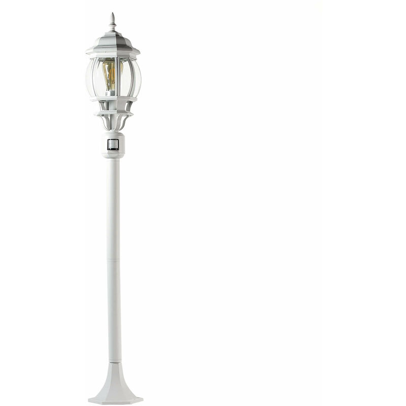 Dettagli del prodotto Materiale: Alluminio, vetro vero Dimensioni: larghezza: 150 mm, altezza: 1235 mm, lunghezza: 150 mm Attacco: 1x E27 fino a. 60 Watt Classe di protezione dagli spruzzi: IP44 Colore: Bianco Peso: 1800 grammo Descrizione del prodotto Lampione per esterni in stile rustico ed elegante realizzata in alluminio e vetro. Grazie al sensore di movimento è la scelta perfetta per il vostro giardino, terrazzo e cortile. Attacco: E27 con una potenza max. di 60 W. Compatibile con lampadine LED e a risparmio energetico (N.B. lampadine non incl.) Angolo di rilevamento: 120° | Raggio d'azione: fino a 8 metri (a seconda delle condizioni atmosferiche)| Durata: regolabile da 10 secondi fino a 8 minuti | Sensibilità dello strumento regolabile IP44: alta protezione da pioggia e insetti da qualsiasi direzione Altezza: 1100 mm;