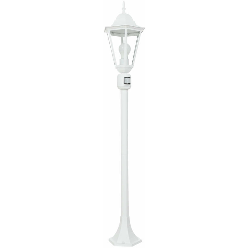 Dettagli del prodotto Materiale: Alluminio, vetro Dimensioni: larghezza: 195 mm, altezza: 1200 mm, lunghezza: 220 mm Attacco: 1x E27 100W konventionell oder 20W CFL Classe di protezione dagli spruzzi: IP44 Colore: Bianco Peso: 2138 grammo Descrizione del prodotto la lámpara de pie rústica de exterior en blanco está hecha de aluminio fundido a presión resistente a la intemperie y de cristal robusto la clásica forma de linterna de la lámpara permite una amplia difusión de la luz y garantiza más seguridad en todos sus caminos el detector de movimiento tiene un ángulo de detección de 120°, el alcance es de hasta 8 metros (dependiendo de la altura de montaje y las condiciones meteorológicas) duración de la luz variable: de 10seg a 8min la elegancia clásica de la luminaria para caminos se integra perfectamente en el estilo existente de su zona exterior: ideal como iluminación de patios o jardines Consejo: esta lámpara de jardín se convierte en un atractivo especial con una bombilla de forma