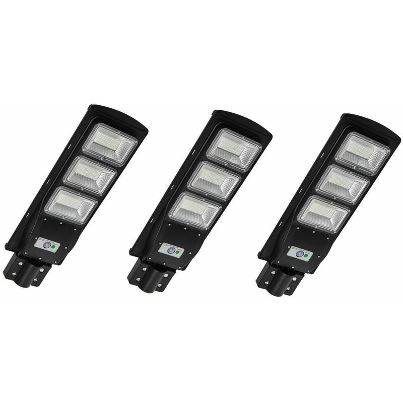 Pack da 3 lampioni da strada ad energia solare, con fari a led 90W e senza fili, caratteristica che lo rende anche semplicissimo da installare. Il corpo in alluminio garantisce per la durata e la resistenza alle intemperie, emette luce bianca fredda grazie all'energia incamerata dal pannello fotovoltaico che ricarica la batteria interna e alimenta i led. Si può fissare su un palo (non incluso) oppure ad un muro e lavorerà autonomamente tramite il sensore crepuscolare oppure e possibile programmarlo tramite il comodo telecomando wireless incluso in confezione. 63 x 25 x 7 cm, per un peso di circa 2,42 Kg, il colore è nero, viene fornito con istruzioni in inglese e l'estetica può variare in base alle disponibilità di magazzino.