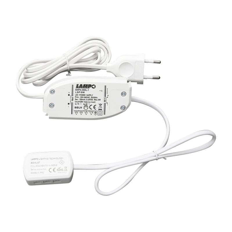 Set di alimentazione completo Lampo Per uso interno Connessione JST(x6) in parallelo Alimentazione: 230 V Lunghezza cavo: 150 cm Tensione in uscita: 12 Vdc Potenza: 6 W Grado di protezione: IP20