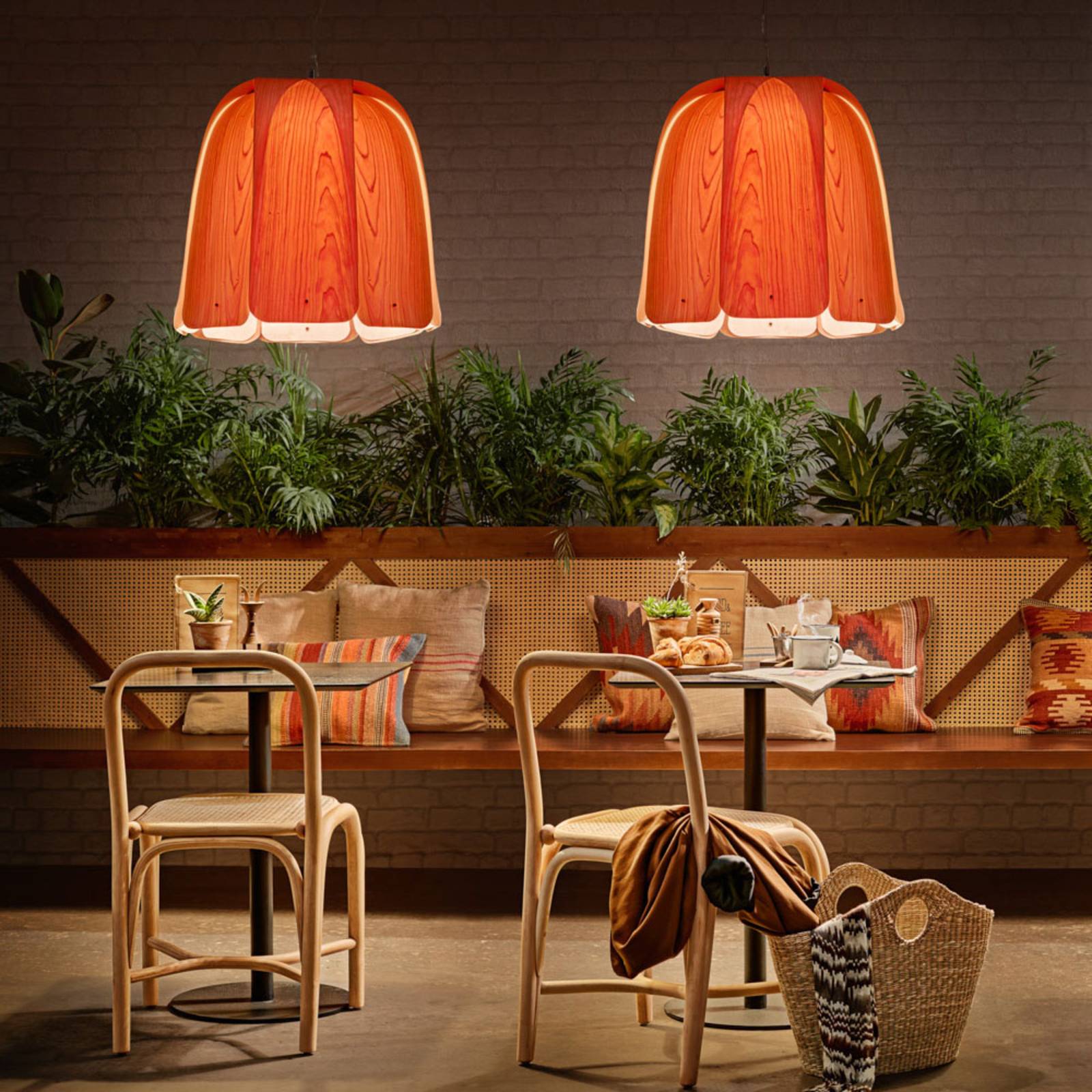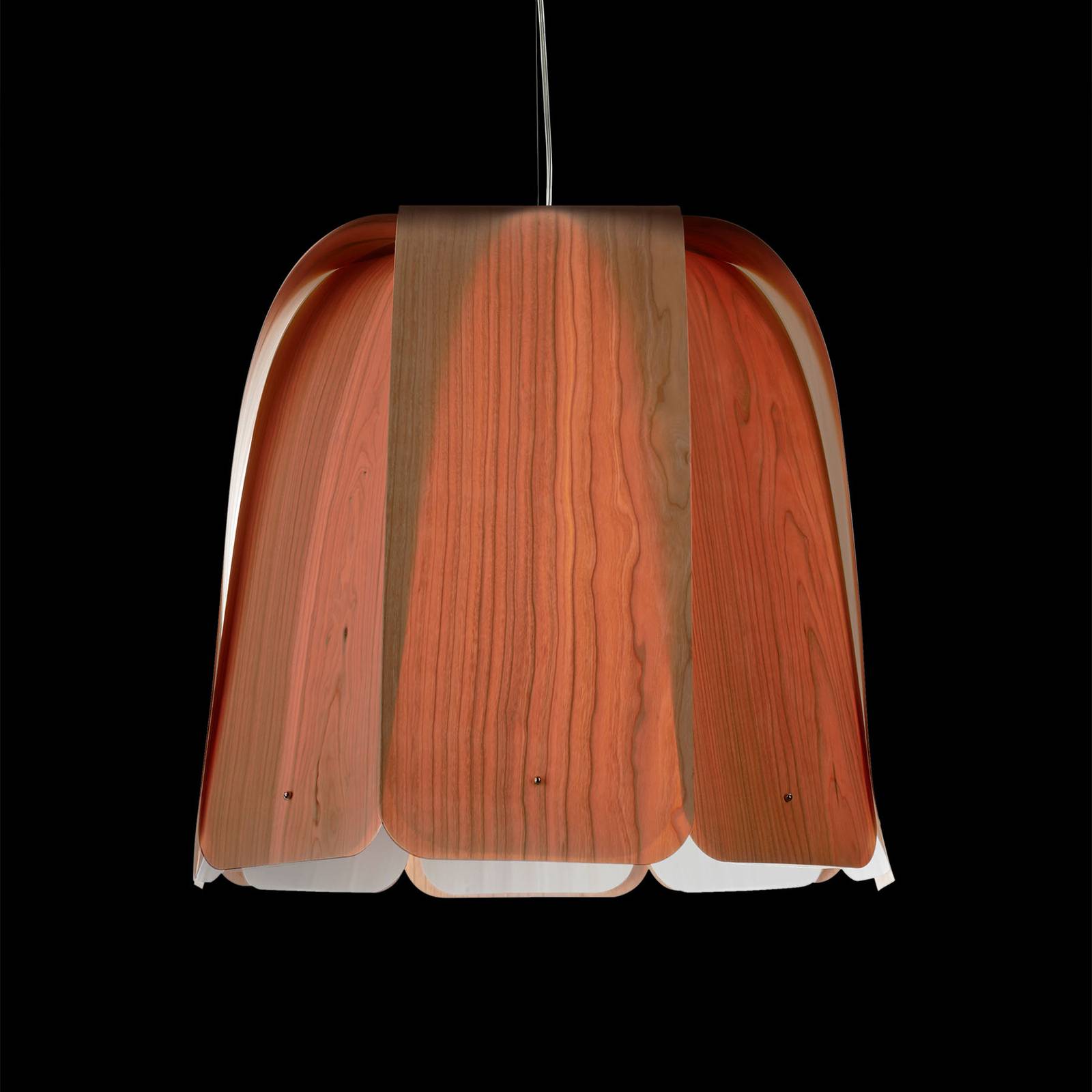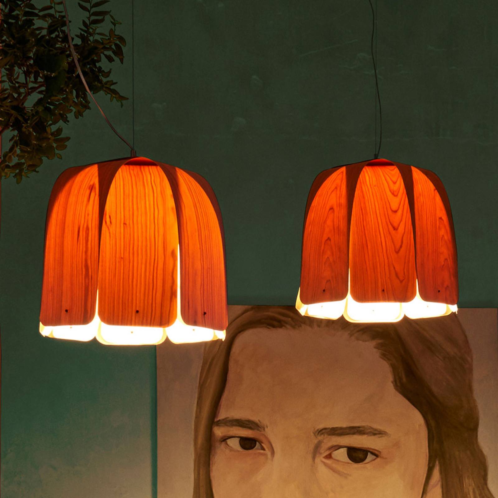 Lampada a sospensione Domo con paralume in legno impiallacciato Un paralume a forma di cupola in legno forma la lampada a sospensione Domo. Uno strato esterno di elementi sovrapposti e uno strato interno di elementi uniti senza soluzione di continuità sono combinati. La lampada da usare all'interno emette la luce direttamente verso il basso - ideale per illuminare i tavoli. Il paralume in legno permette anche alla luce di brillare delicatamente ai lati e fornisce un accento naturale nella stanza con le sue venature. Il produttore spagnolo LZF-Lamps produce le sue lampade a mano e utilizza legno ecologico e sostenibile (certificato FSC®). La lampada a sospensione Domo è stata creata dai designer industriali di Valencia Roberto Celada e Raquel Esteve (Rqr Estudio).