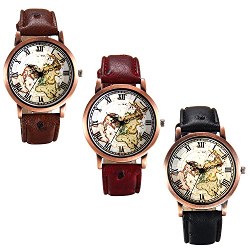 Lancardo Orologio da Polso Uomo Donna con Cinturino in Poliuretano Quadrante Numeri Romani Mappa del Mondo Impermeabile, Marrone