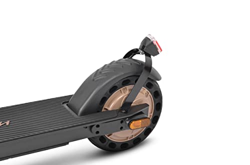 Questo monopattino elettrico è dotato di freni su entrambe le ruote, segnalatore acustico, indicatori di svolta, luce anteriore bianca/gialla e luce posteriore rossa.