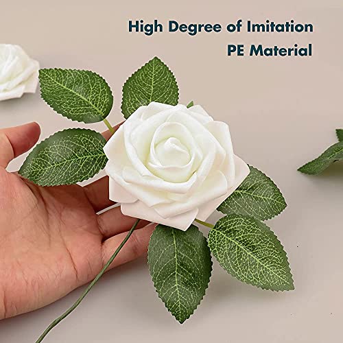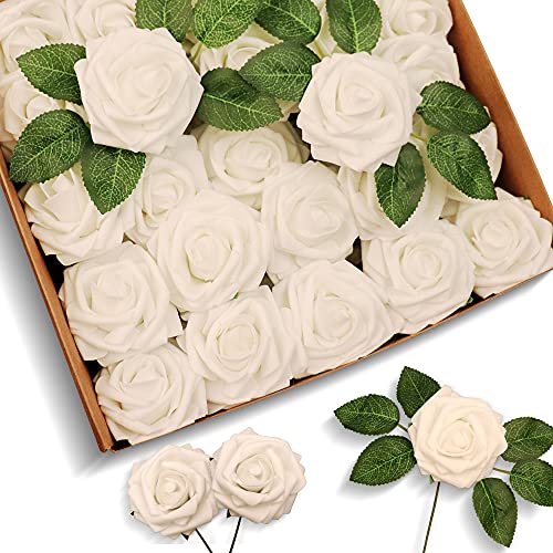 LangRay Fiori Artificiali, 50 Pezzi Rose Artificiali per Bouquet Fai Da Te Reale Cercando Rose Finte Di Rose Alte Imitazione Seta Stampate per Anniversario Compleanno Matrimonio San Valentino,Bianco