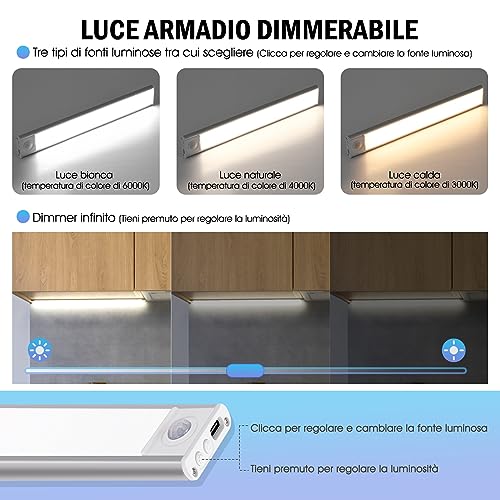 Lanlelin Luce Armadio LED 4pcs, Armadio Led con Sensore di Movimento, Magnetica Ricaricabile Luce Led Sottopensile Dimmerabile Lampada per Cucina Scale Soggiorno Bagno Camere da Letto