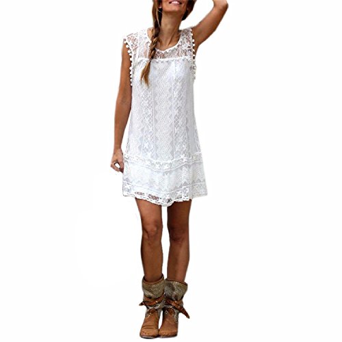 Lannister Fashion Donna Vestiti Senza Maniche Abito Cerimonia Elegante Estivo Corti Vintage in Pizzo Bianco Palla Allentato Vestito Corte Dress Femminile per Festa Ballo Partito Bianco (XL)