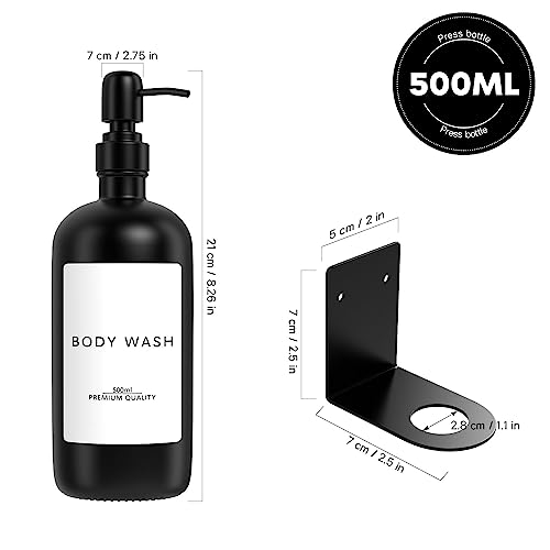 Lannvan 3 Pezzi Dispenser Sapone Muro - 500ml Dispenser Sapone Bagno Vetro Nero opaco - Dosatore a pompa in Acciaio Inossidabile per Erogatore Sapone Liquido, con 18 etichette impermeabili