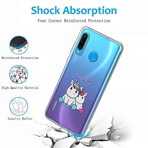 Lanpangzi Compatibile con Custodia Huawei P30 Lite Cover + 5D Pellicola Vetro Temperato Tecnologia TPU Silicone Trasparente Slim Cover Anti Graffio Protettiva Case - Coppia Unicorni