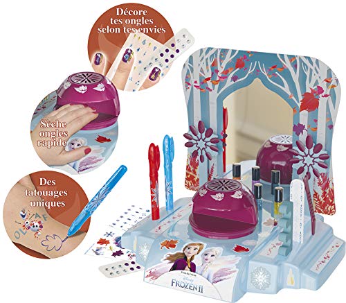 Ritrova tutta la magia di Frozen II in questo cofanetto. La barra per unghie Frozen II raggruppa tutti gli accessori per fare una vera manicure di principessa: smalti glitterati, adesivi per unghie.